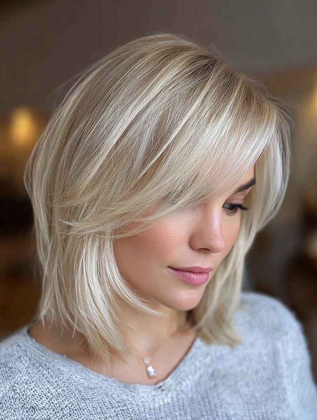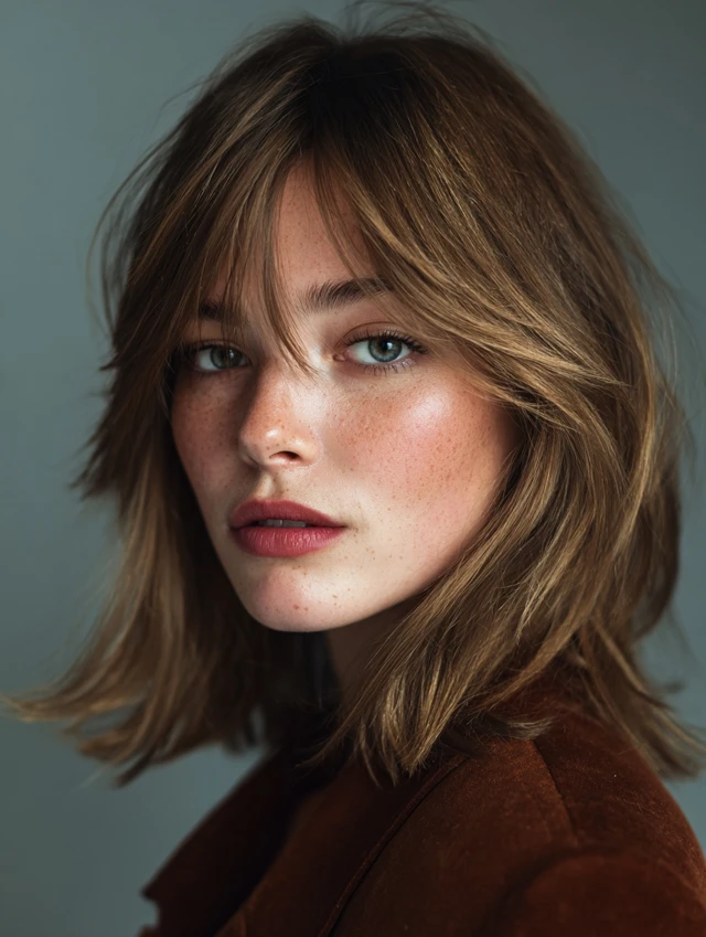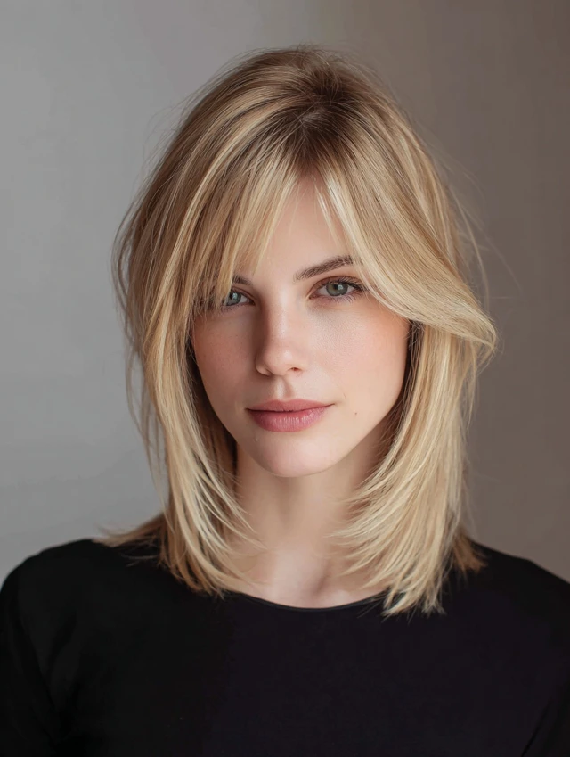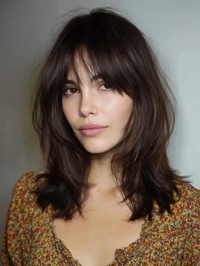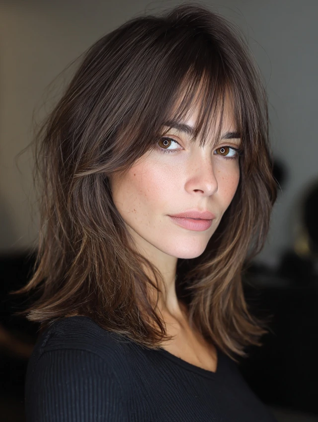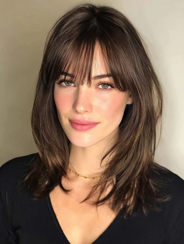 Curtain bangs add volume around the face, while shoulder-length hair keeps styling light and airy.