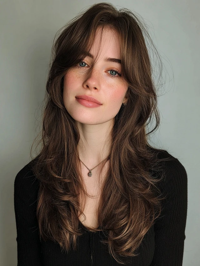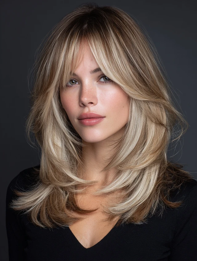 Side-swept layers reduce heaviness while creating a flattering face frame.