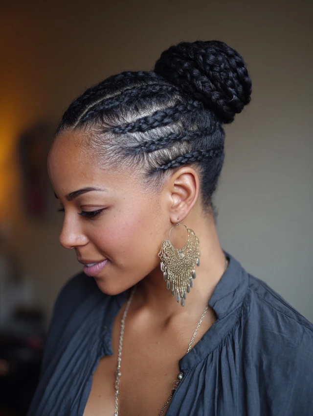 5. Cornrows into a Bun or Ponytail