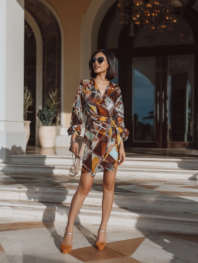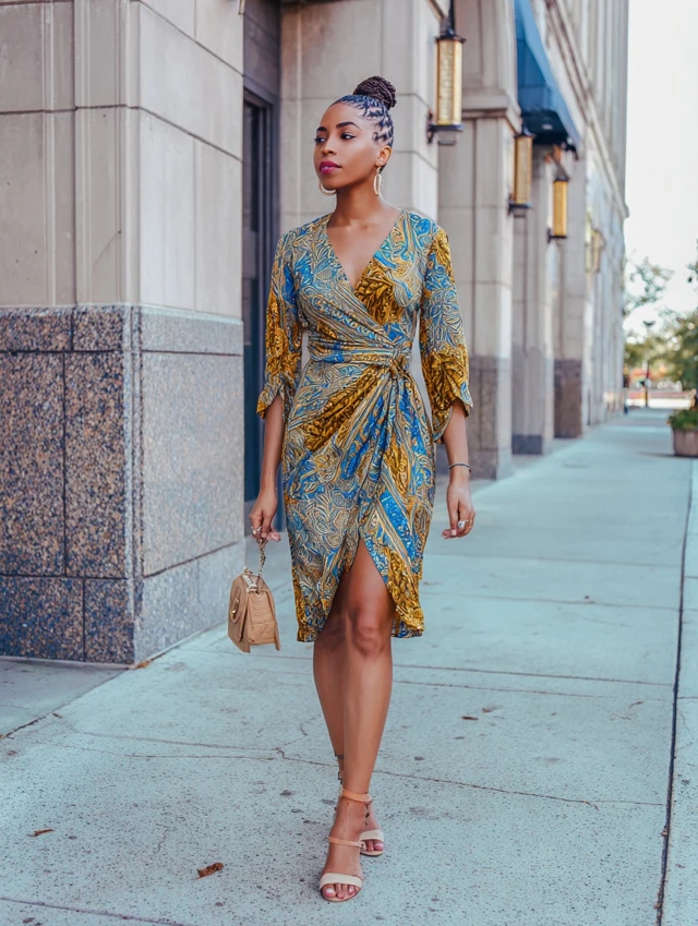Why It Works: A wrap dress is universally flattering and when made in Batik fabric, it blends elegance with ease. Perfect for women on the go.