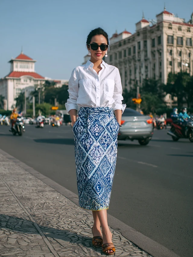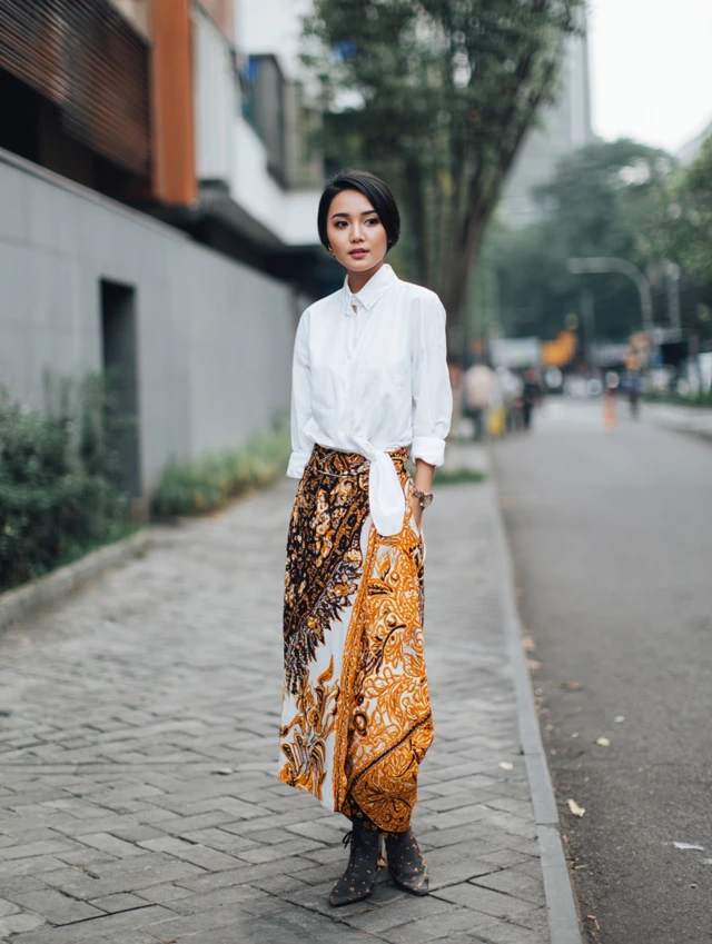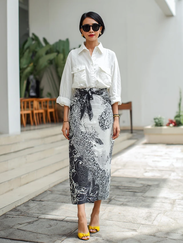 Why It Works: This combo is the ultimate modern classic. The crispness of a white shirt balances the boldness of Batik.