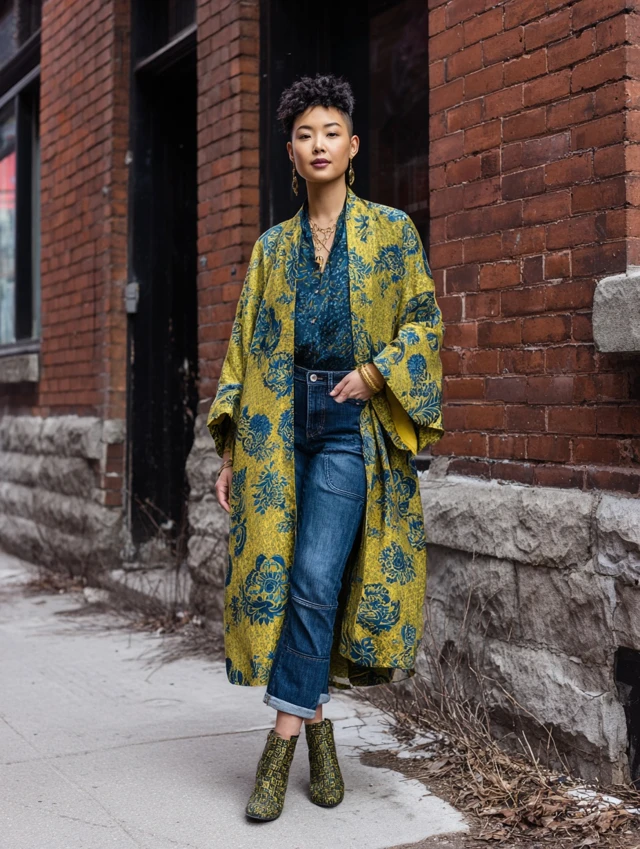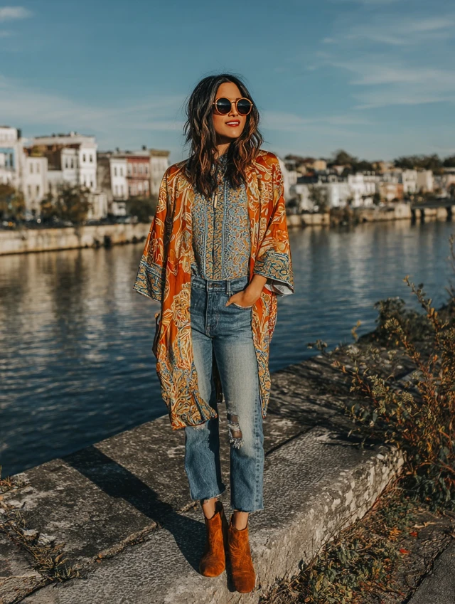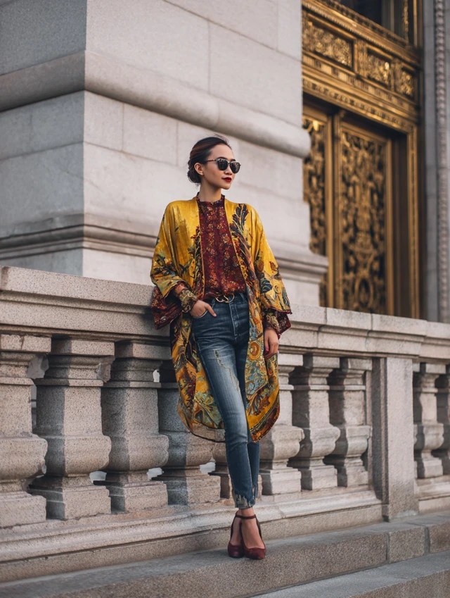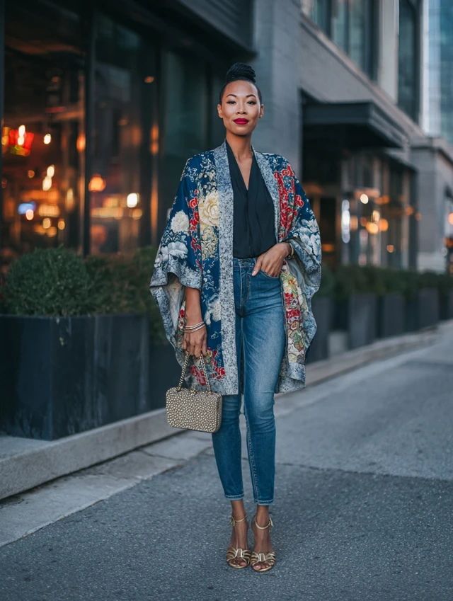 Why It Works: A Batik kimono instantly elevates basic denim and tee outfits, making casual look luxe.