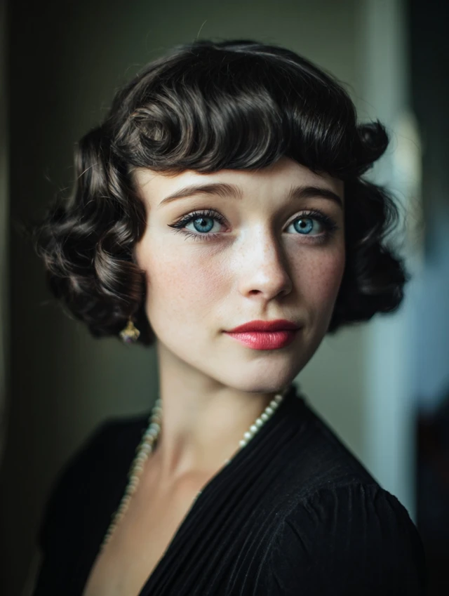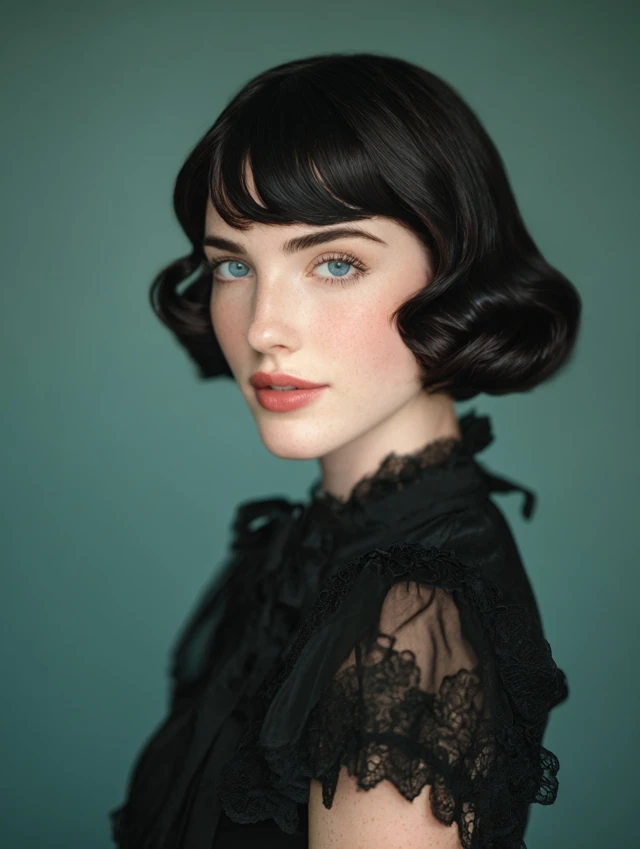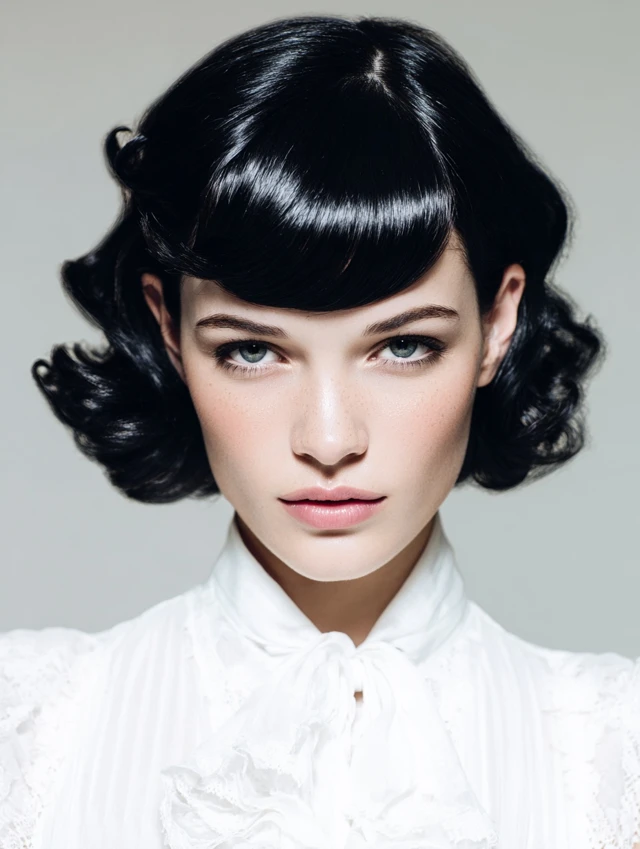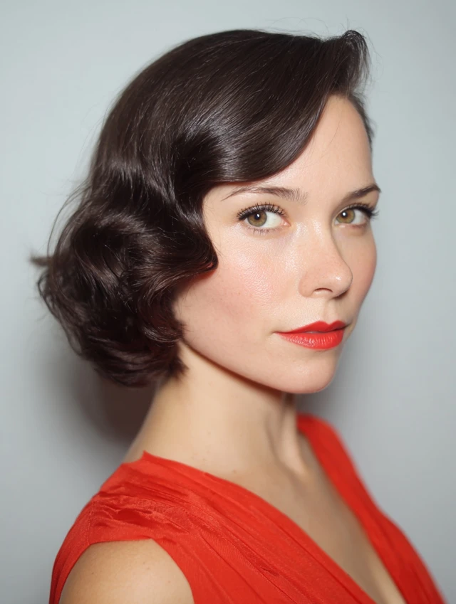Blunt bangs paired with finger waves create a bold, modern-meets-vintage look.