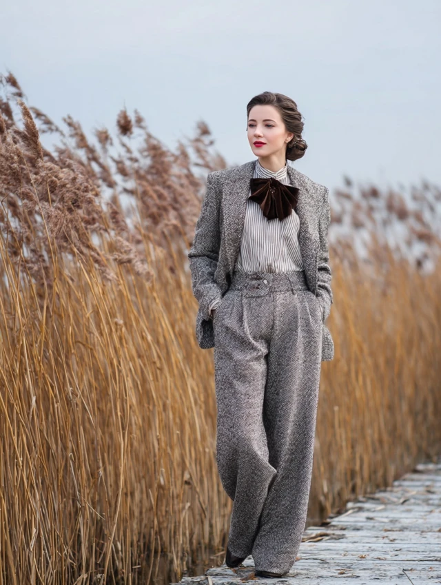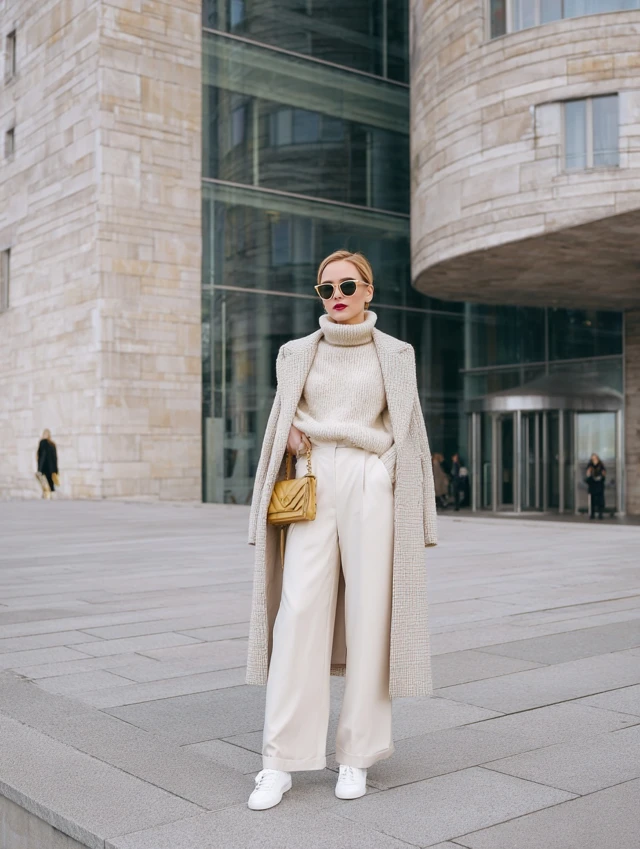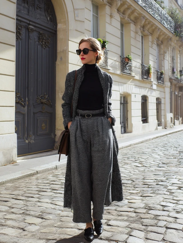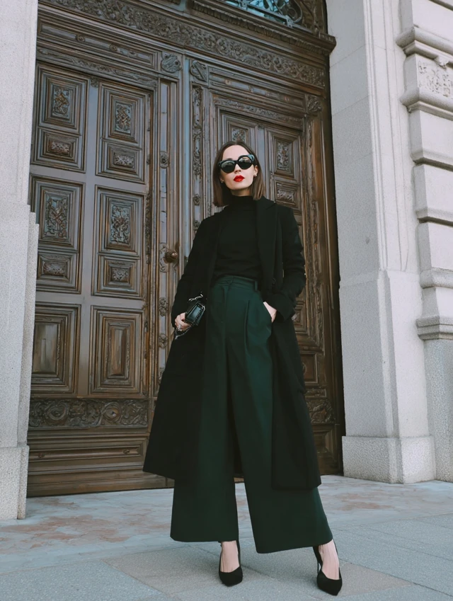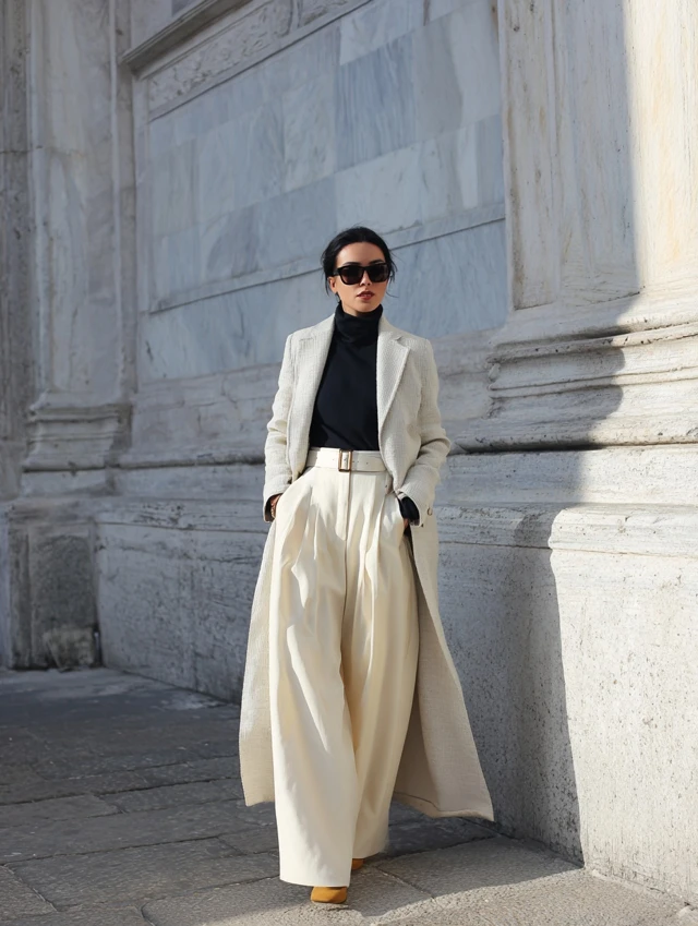 Why It Works: Wide-leg trousers bring elegance, while a sharp coat frames authority.