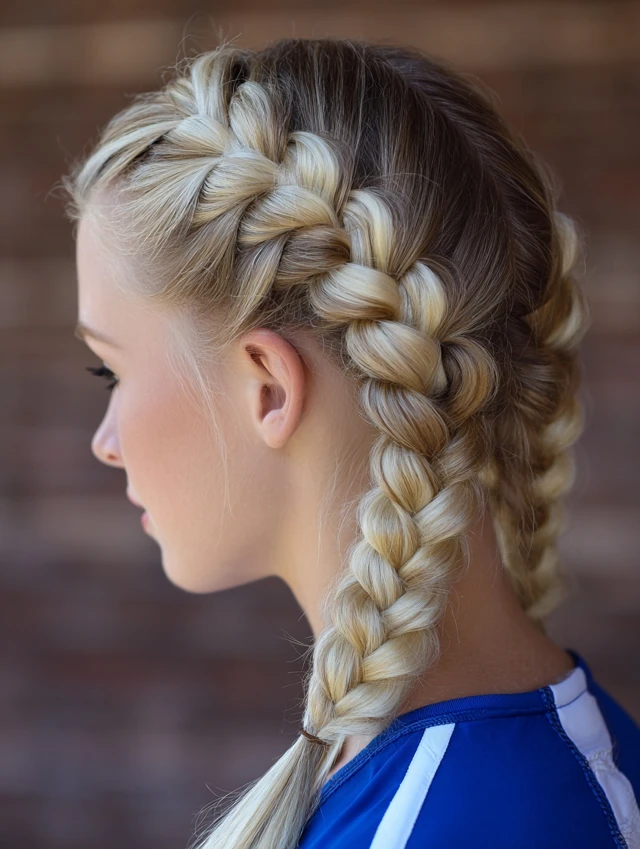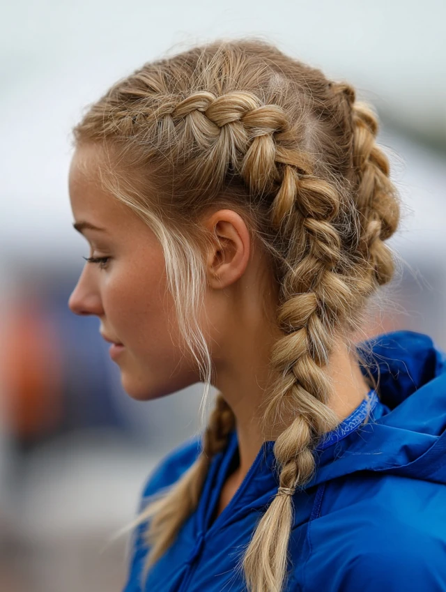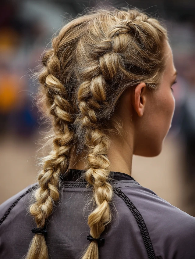 Dutch braids lock hair in place while distributing tension evenly—perfect for long matches.