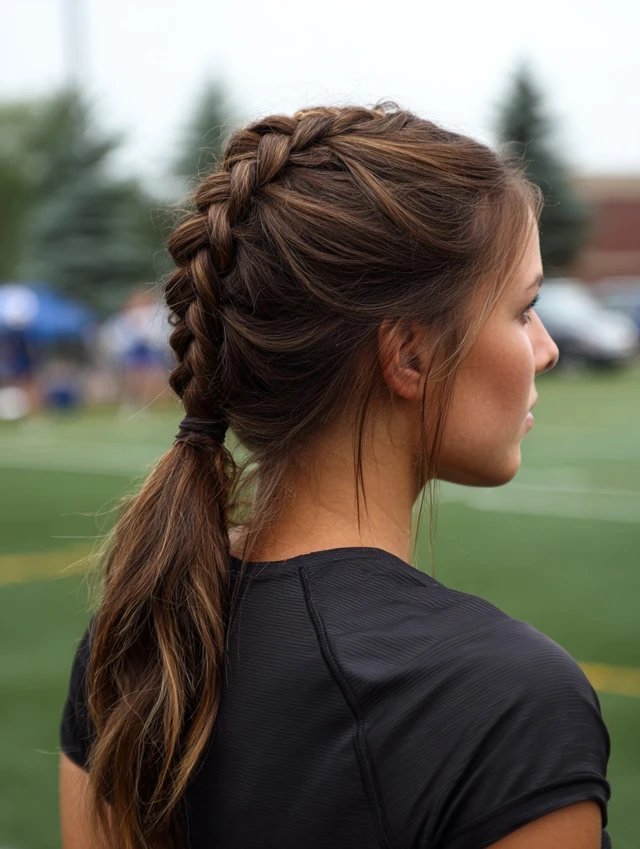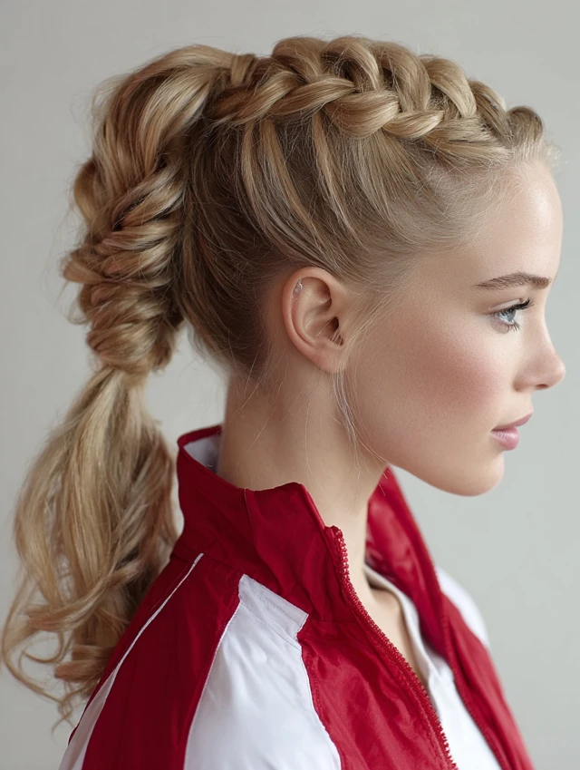A sleek ponytail with a braid stays secure, prevents flyaways, and adds stylish movement as you run.