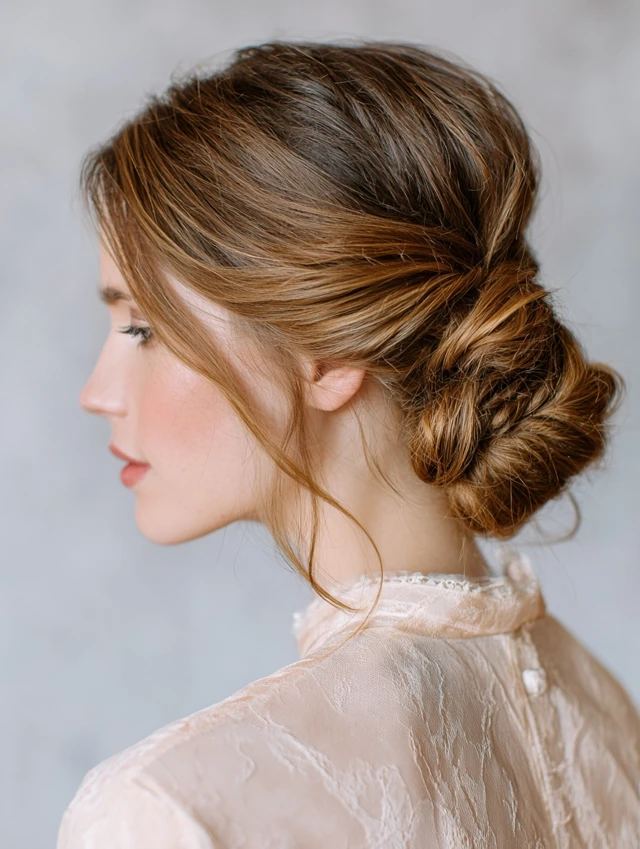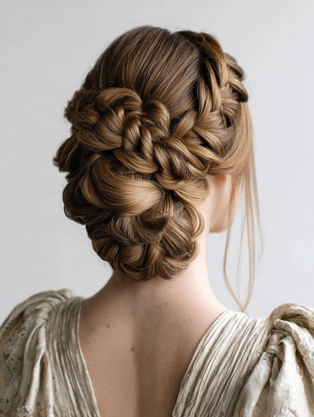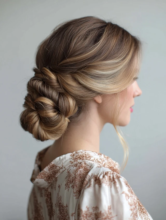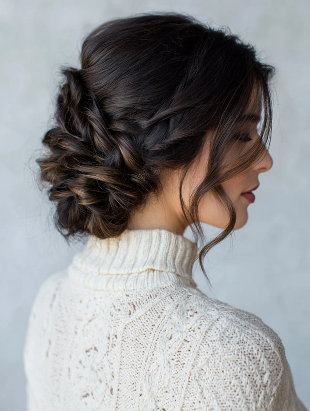 A low braided bun keeps hair neat while looking intricate and stylish.