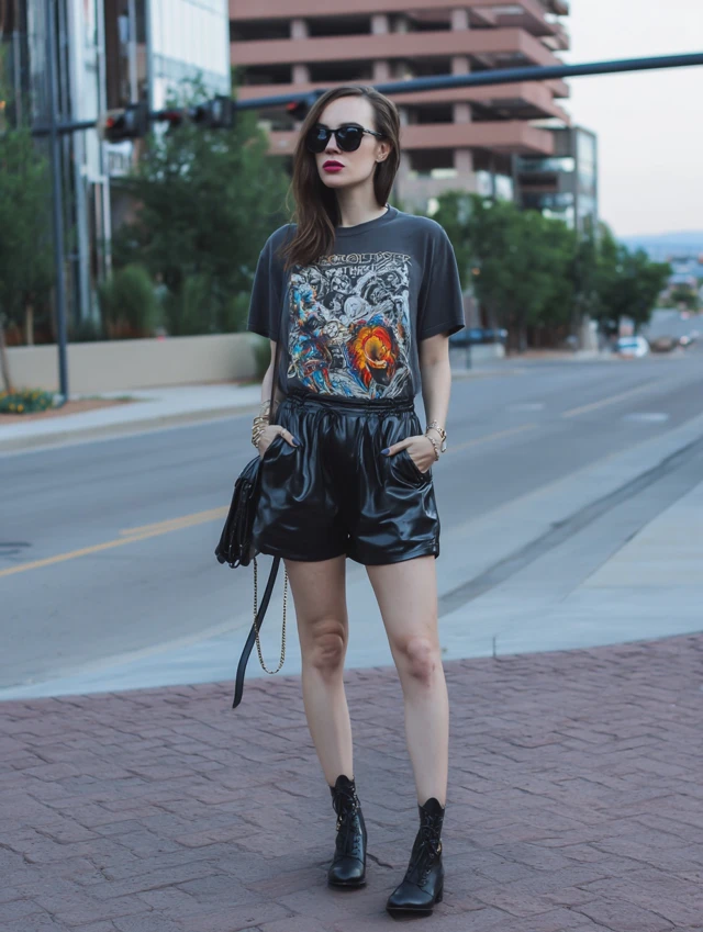 Why It Works: Edgy yet wearable, the leather shorts elevate the casual tee instantly.