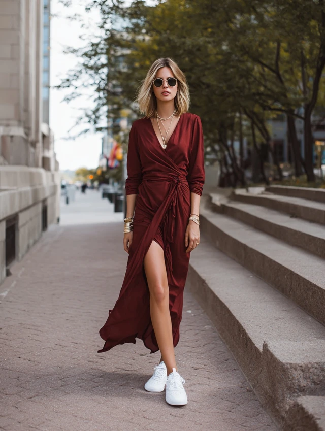 Why It Works: A wrap cut enhances curves, while sneakers keep it casual yet chic.