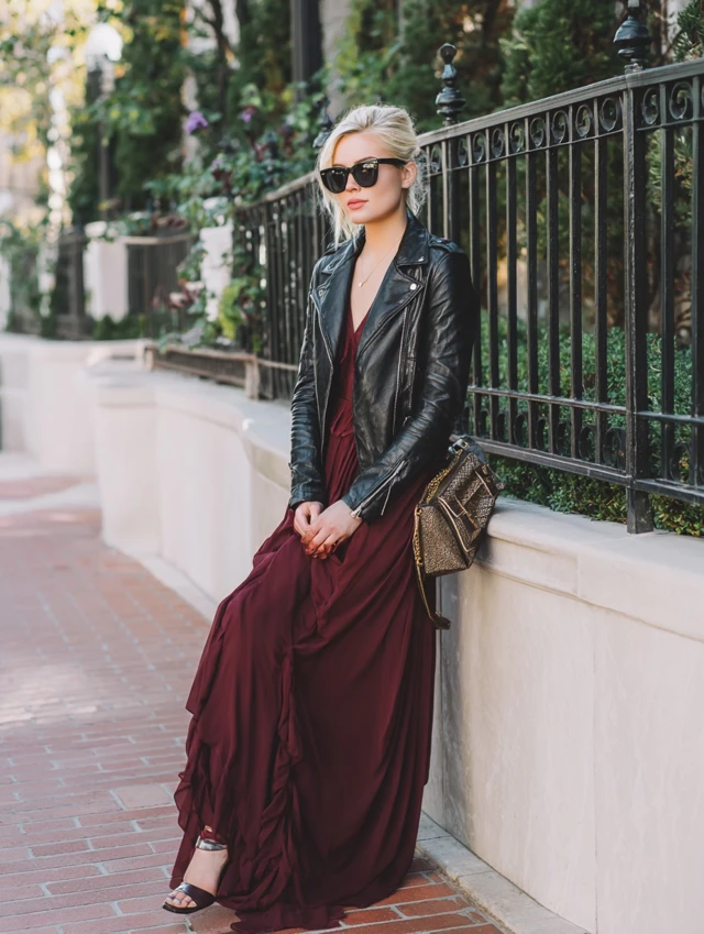 Why It Works: Flow meets edge. The leather toughens up the softness of the maxi.