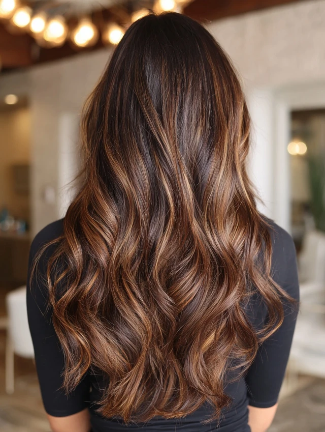 • Lighter brown or caramel highlights on mid-lengths and ends