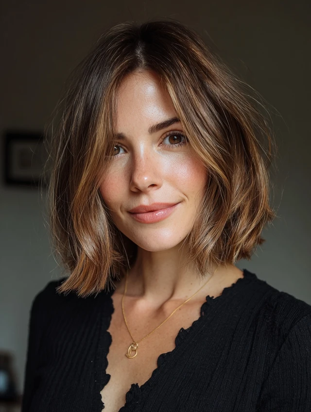 A shoulder-length bob with balayage highlights creates a polished, modern appearance.