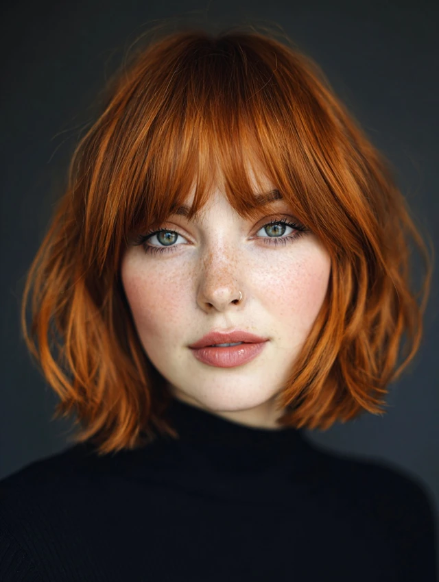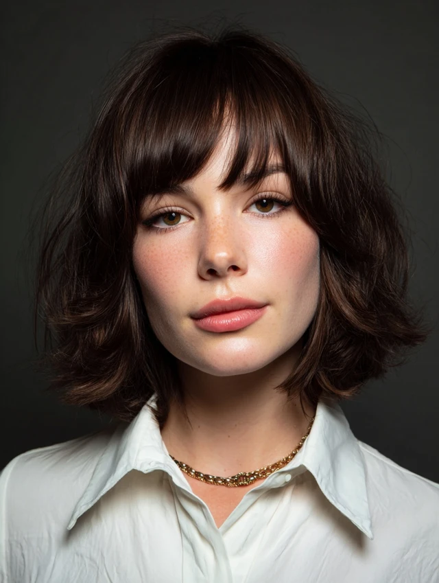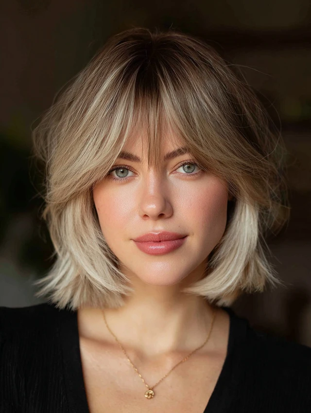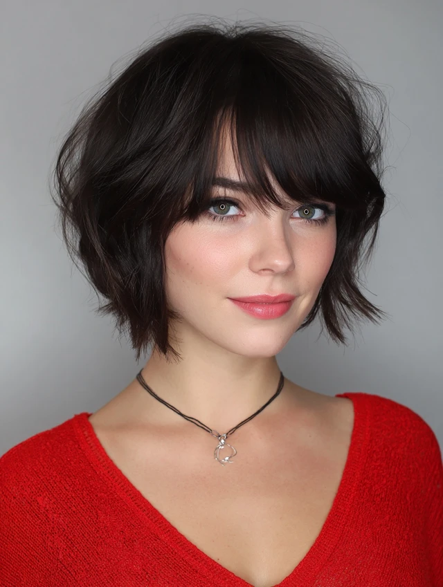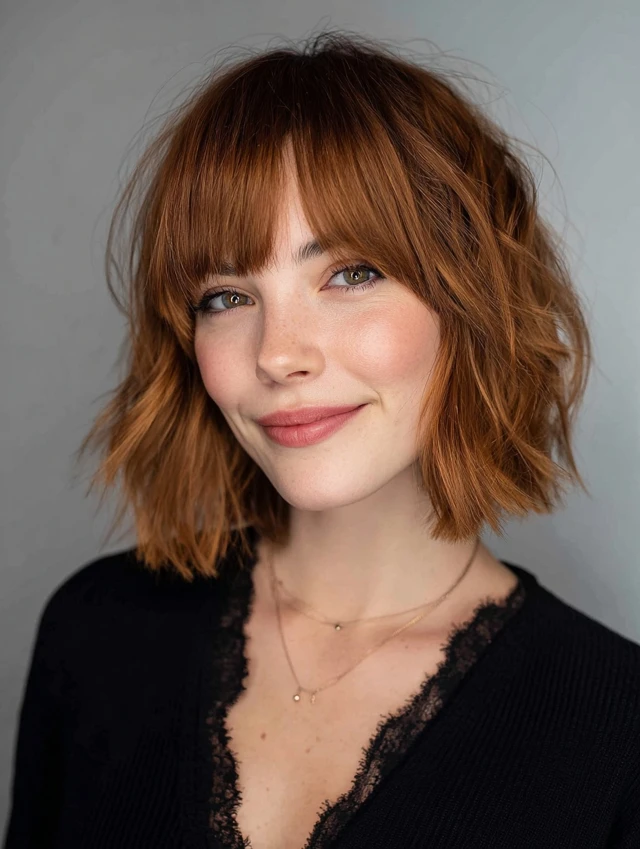 Side-swept bangs, curtain bangs, or layers that skim the chin for balance.