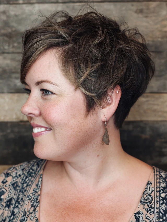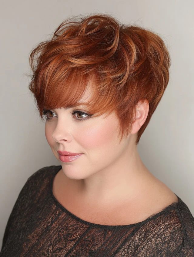 Side-swept bangs elongate the face, and layered pixie adds height at the crown to balance a double chin.