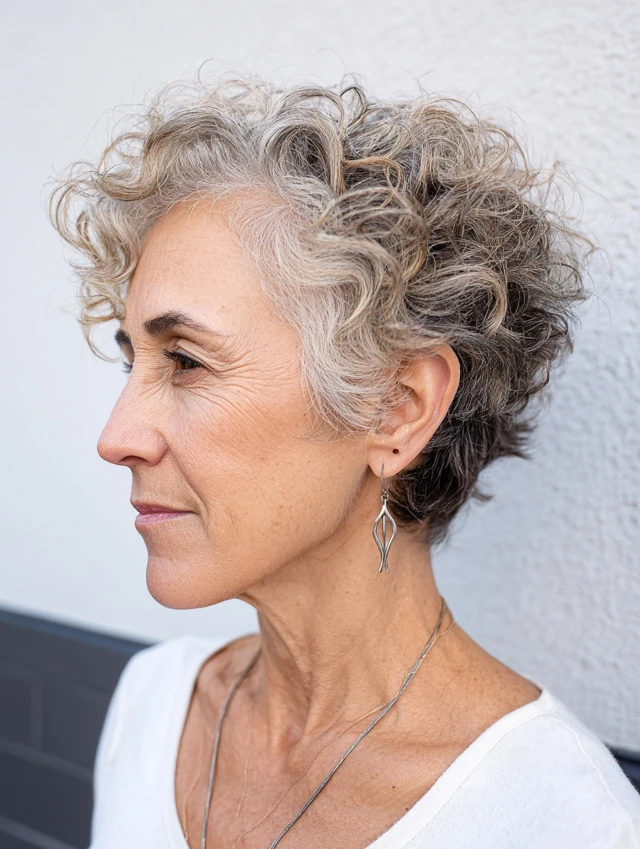 Women over 50 seeking a modern, flattering short curly haircut.