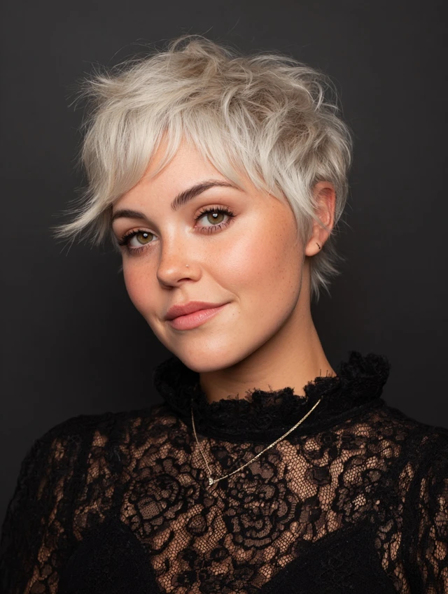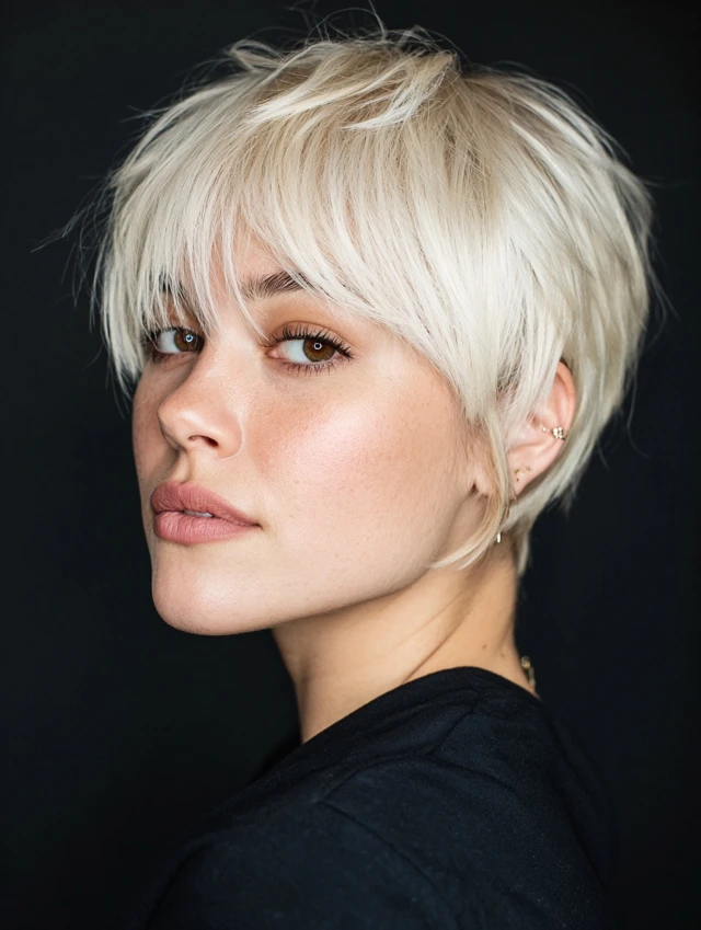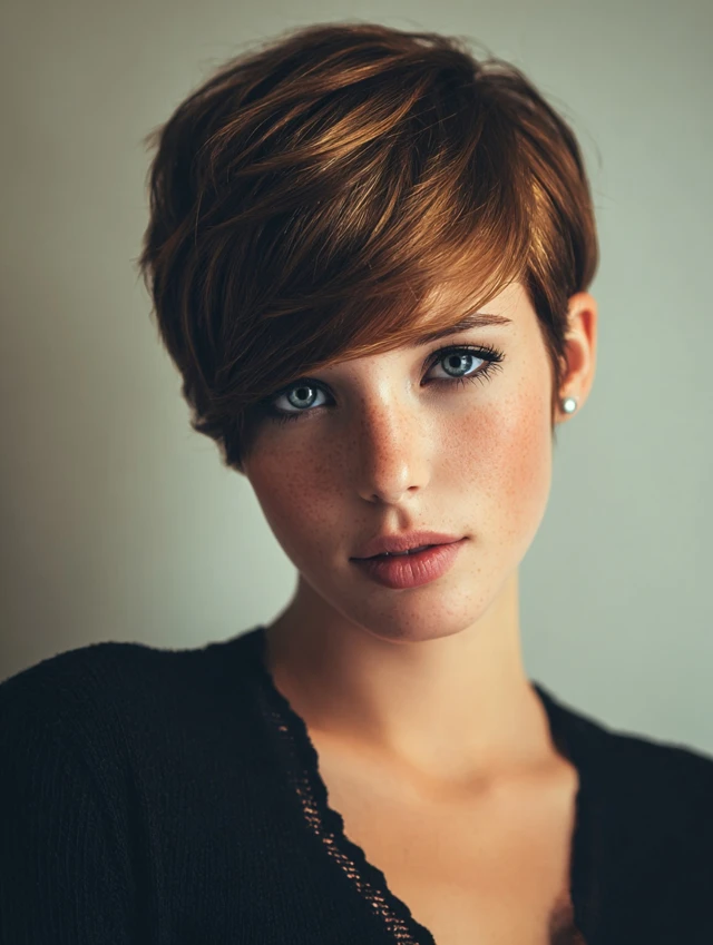 Side-swept bangs elongate the face, while a pixie cut adds volume at the crown.