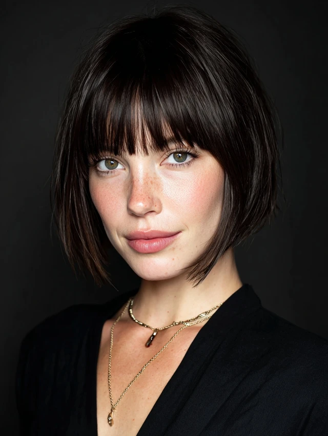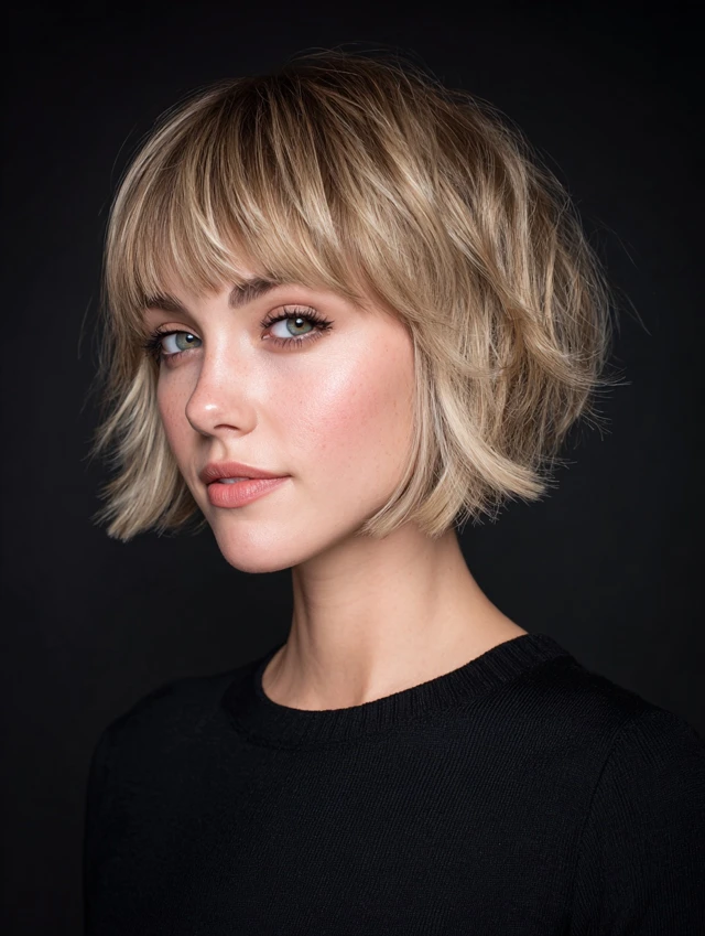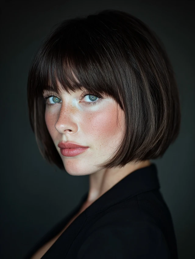 Blunt bangs frame the face while stacked layers add lift and fullness at the crown.