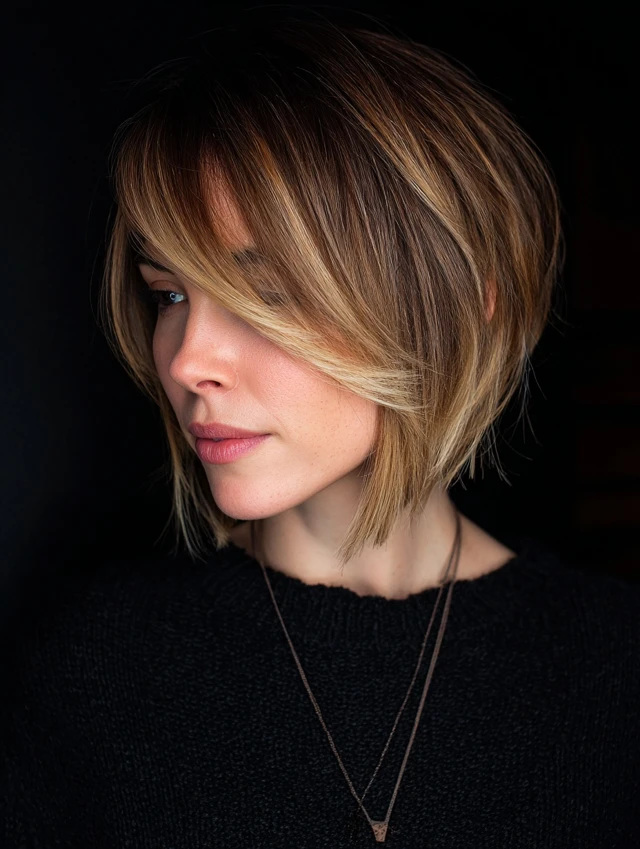 Side-swept bangs soften facial angles while layers add movement and volume.