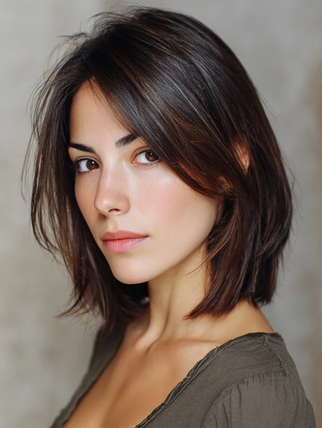Layered shoulder-length bob, U-cut, soft layered cut, blunt ends with layers, or feathered ends.